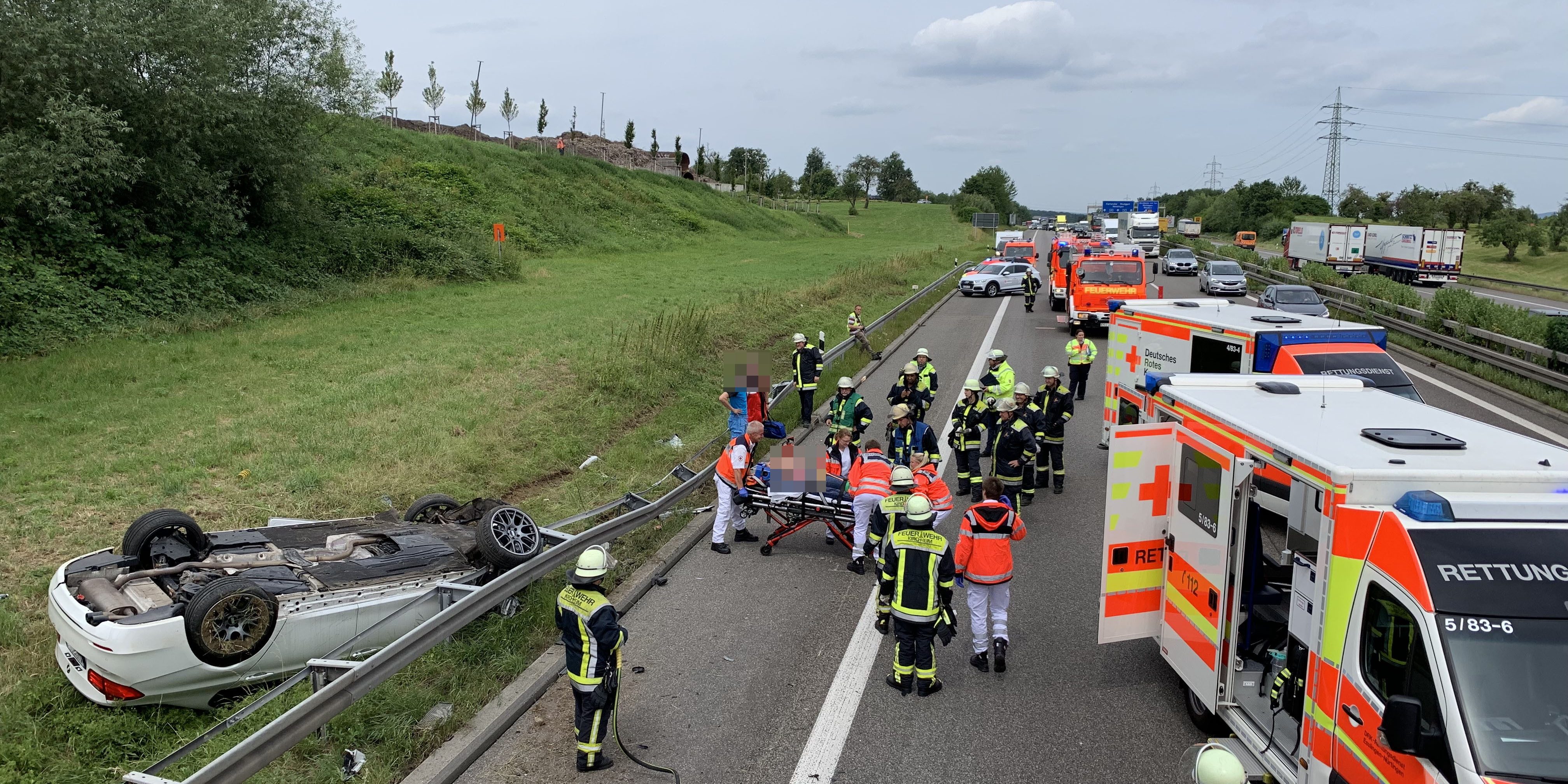 Auf der BAB 8, Fahrtrichtung München, zwischen den Anschlussstellen KH-West und KH-Ost kam es am Montagmittag zu einem schweren Verkehrsunfall, bei welchem sich ein Fahrzeug überschlagen hatte und auf dem Fahrzeugdach zur Endlage kam. Da aufgrund des Unfallhergangs zunächst von eingeklemmten Personen ausgegangen werden musste, wurde die Feuerwehr Kirchheim alarmiert. Beim Eintreffen an der Unfallstelle konnte festgestellt werden, dass keine Personen im Fahrzeug eingeklemmt waren. Der Rettungsdienst wurde nachfolgend durch die Feuerwehr beim Transport der Patienten unterstützt. Des Weiteren wurde die Unfallstelle abgesichert, der Brandschutz sichergestellt sowie die Fahrzeugbatterie abgeklemmt. Die beiden Verletzten wurden durch den Rettungsdienst in umliegende Krankenhäuser verbracht.