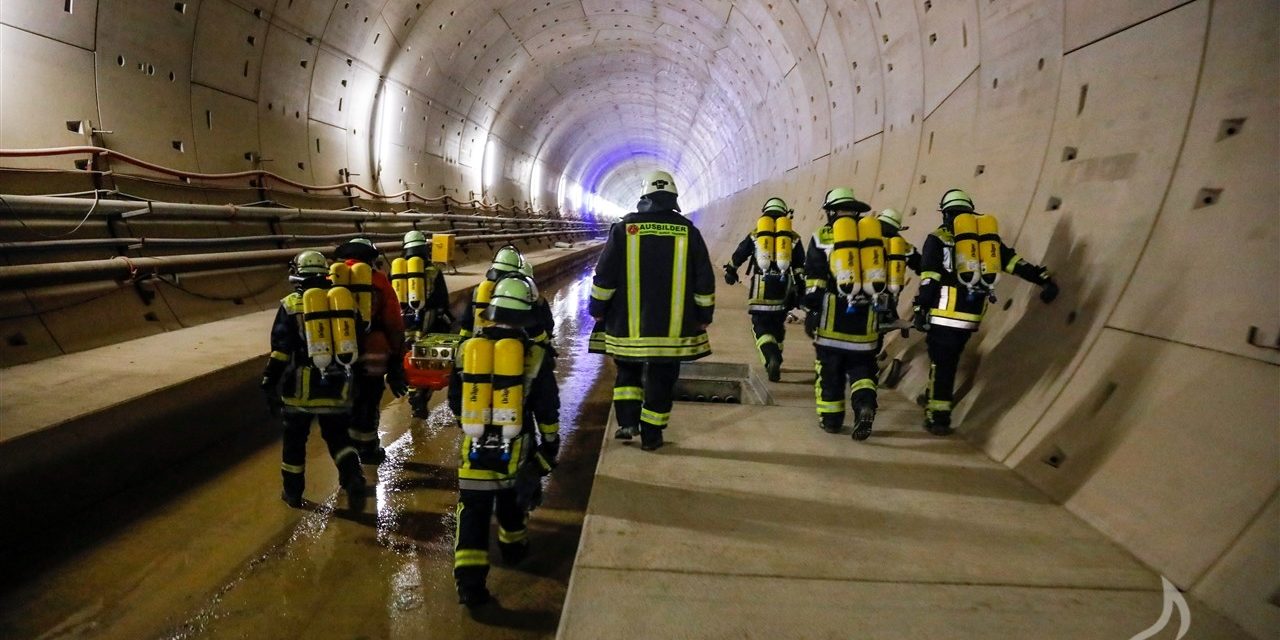 Genau deshalb fand und findet an mehreren Samstagen am Wendlinger Tunnelportal eine Einweisung und Ausbildung von Multiplikatoren auf die Gegebenheiten und die neue Ausrüstung durch die Rettungswehr statt. In Theorie und Praxis wurde auf das Vorgehen der Feuerwehr und die auf dieser Baustelle herrschenden Gefahren eingegangen. Mit schweren Langzeitpressluftatmern und Schlauchmaterial ausgerüstet, machten sich im Praxisteil die Teilnehmer in 5-Mann-Trupps auf den Weg in den Tunnel. Keine leichte Aufgabe, denn das Gewicht der Ausrüstung und die Laufwege zum Einsatzort von bis zu 500 Meter unter Atemschutz sind nicht zu unterschätzen. Wenn dann noch ein gefüllter Schlauch mitgezogen werden muss, ist die Belastungsgrenze nicht mehr weit, was die Teilnehmer am eigenen Leib erfahren konnten. Abschließend wurde noch die Rettung einer verletzen Person bzw. das Besteigen eines Gerüstes im Tunnel unter Atemschutz geübt.