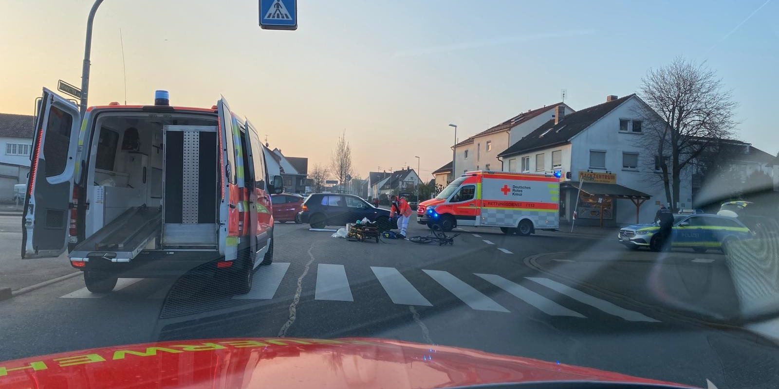 Bei einem Verkehrsunfall zwischen einem PKW und einem Radfahrer, in unmittelbarer Nähe zur Feuerwache, wurde eine verletzte Person bis zum Eintreffen des Rettungsdienstes erstversorgt.