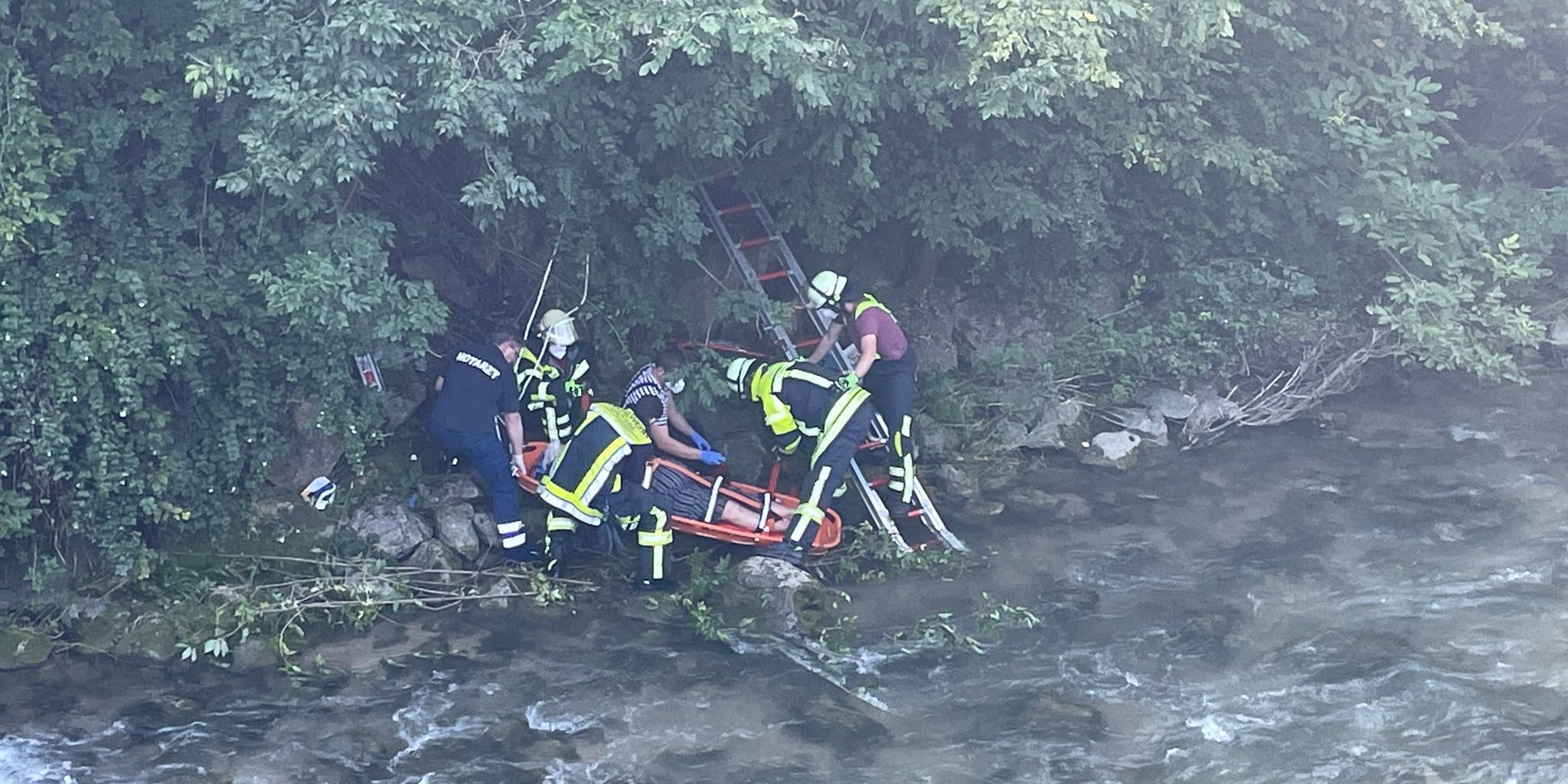 Eine gestürzte Person musste mittels Schleifkorbtrage und Steckleiterteilen aus steilem, unwegsamem Gelände gerettet werden.