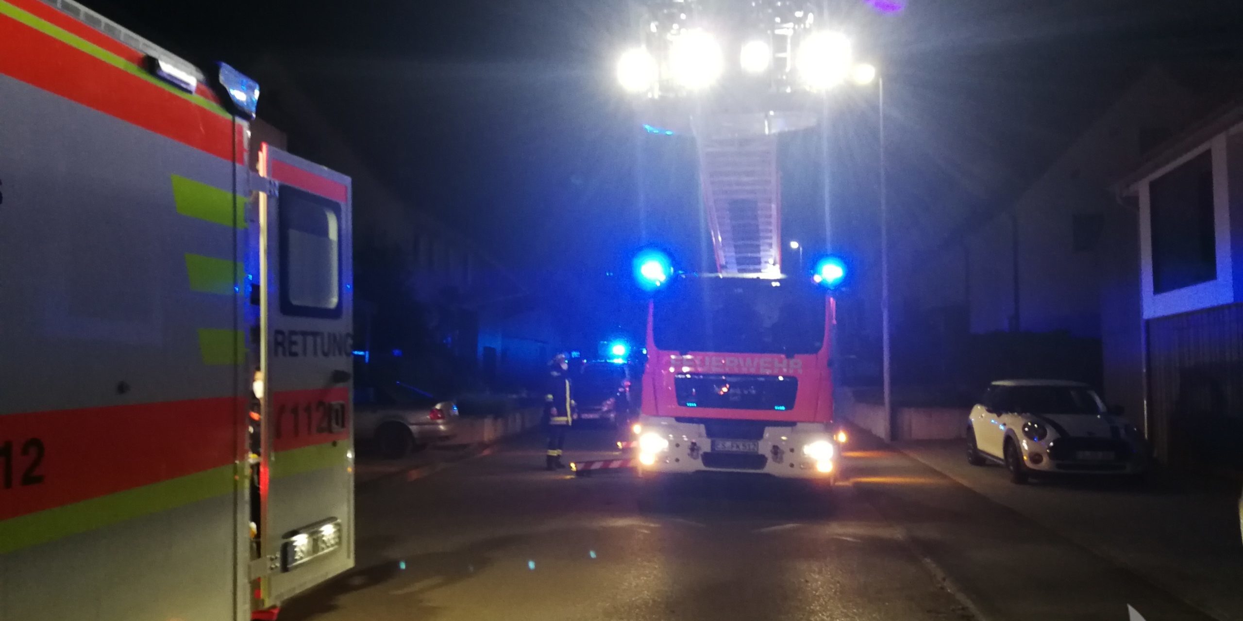 Eine Person musste aus dem 1. Obergeschoss mittels Schleifkorbtrage, über die Drehleiter gerettet werden.