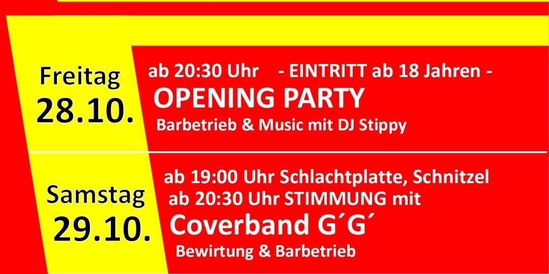 In bewährter Art starten wir am Freitag mit der Opening Party mit DJ Stippy, Eintritt ab 18 Jahren. Am Samstag gibt es Stimmung mit der Coverband G‘ G‘ und am Sonntag gibt es den ganzen Tag Programm für jedes Alter vom Frühschoppen mit einer Fahrzeugschau, Mittagessen, Kaffee & Kuchen, Kinderrundfahrten, Hüpfburg & Kinderschminken, einer Einsatzschauübung und im Anschluss Stimmung mit DJ itzen flitzen.