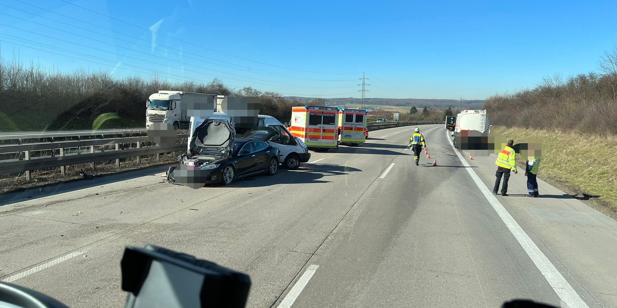 Der Unfall ereignete sich kurz nach 11.45 Uhr zwischen den Anschlussstellen Kirchheim (Teck) - West und Wendlingen in Richtung Stuttgart. Der 58-Jährige Fahrer eines Tesla fuhr auf dem linken Fahrstreifen und überholte ein Wohnmobil auf dem mittleren Fahrstreifen. Dabei stieß er gegen das Wohnmobil. Beide Fahrzeuge gerieten ins Schleudern. Der Tesla geriet in die Mittelleitplanke. Das Wohnmobil der 26-Jährigen prallte gegen einen Tanklaster auf dem rechten Fahrstreifen. Bei dem Unfall erlitten die Fahrerin des Wohnmobil und ihr 29-Jähriger Beifahrer leichte Verletzungen. An den drei beteiligten Fahrzeugen entstand ein geschätzter Sachschaden von 49.000 Euro. An dem Laster wurde der Tank beschädigt. Den Kraftstoff pumpte die Feuerwehr ab. Der Tesla und das Wohnmobil mussten abgeschleppt werden. Eine Spezialfirma reinigte die Autobahn an der Unfallstelle. Die Autobahn musste voll gesperrt werden und konnte gegen 15.30 Uhr wieder freigegeben werden. Der Verkehrsdienst Mühlhausen ermittelt nun den genauen Hergang des Unfalls.