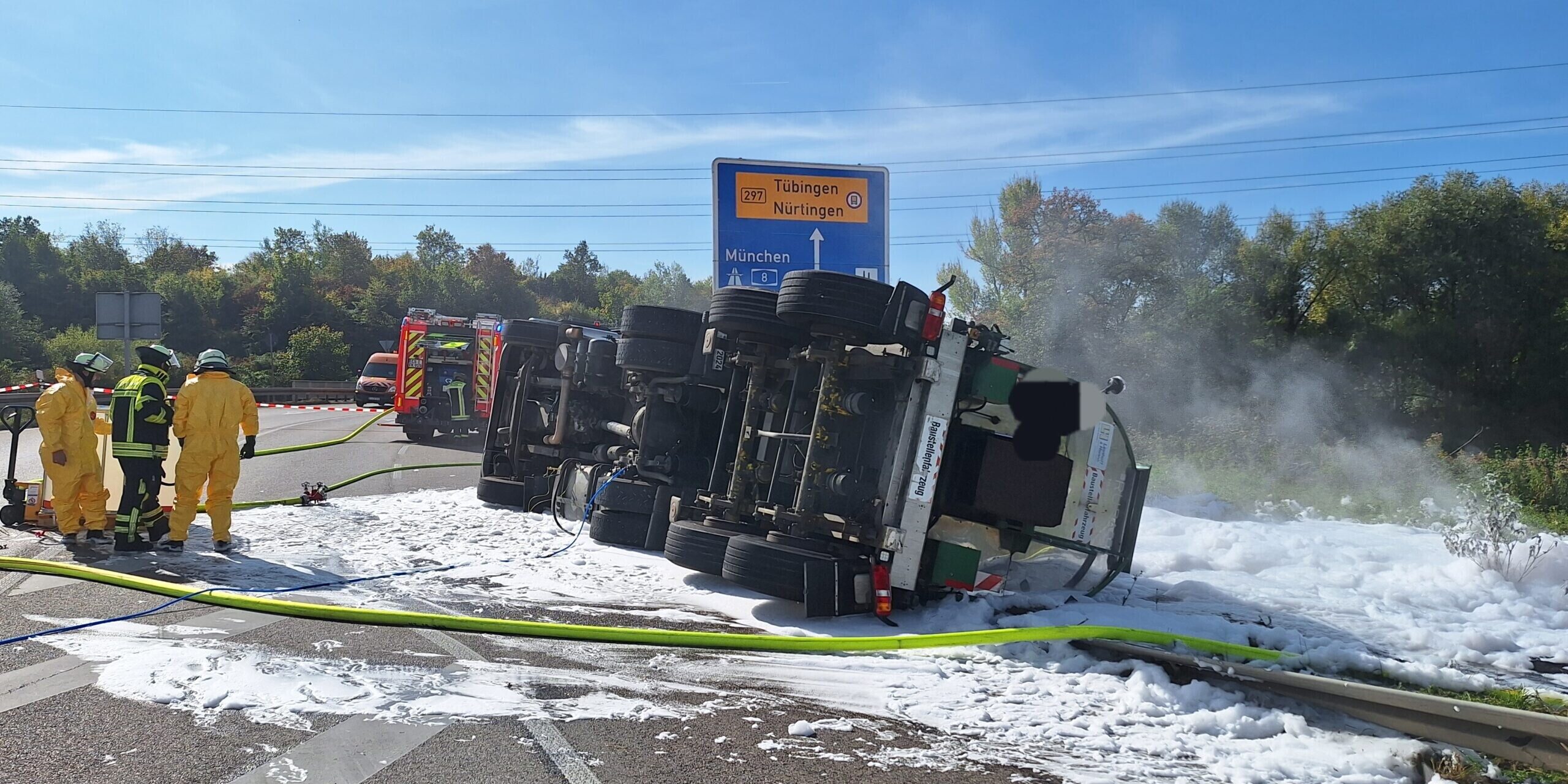 Zu Verkehrsbehinderungen hat ein Verkehrsunfall geführt, der sich am Freitagvormittag auf der L 1200a (Hegelstraße) ereignet hat. Ein 58-Jähriger wollte gegen 11.40 Uhr mit seinem, mit Bitumen beladenen Lkw von der Tankstelle herkommend, nach links in die L 1200a in Richtung B 297 einbiegen. Den verkehrspolizeilichen Ermittlungen zufolge dürfte er dabei zu schnell gewesen sein, weshalb sich die Ladung aufschaukelte und der Lkw in der Folge nach rechts umkippte. Dabei ergoss sich das Bitumen auf eine Fläche von geschätzten 60 qm auf die angrenzende Grünfläche. Der Fahrer wurde bei dem Unfall nach derzeitigen Erkenntnissen leicht verletzt. Ein Rettungswagen brachte ihn zur Untersuchung und Behandlung ins Krankenhaus. Zur Verhinderung einer Entzündung des Bitumens und zur Unterstützung der Bergungsmaßnahmen war die Feuerwehr mit zahlreichen Feuerwehrleuten im Einsatz. Vertreter der Wasserbehörde und des Landratsamtes waren vor Ort. Die Bergungs- und Aufräumarbeiten, für die Spezialfahrzeuge erforderlich sind, dauern derzeit (Stand 16.30 Uhr) noch an. Die Landesstraße und die Ausfahrt Kirchheim-West der A8 ist in Richtung Kirchheim bis auf Weiteres gesperrt. Zur Höhe des entstandenen Sachschadens liegen noch keine Angaben vor.