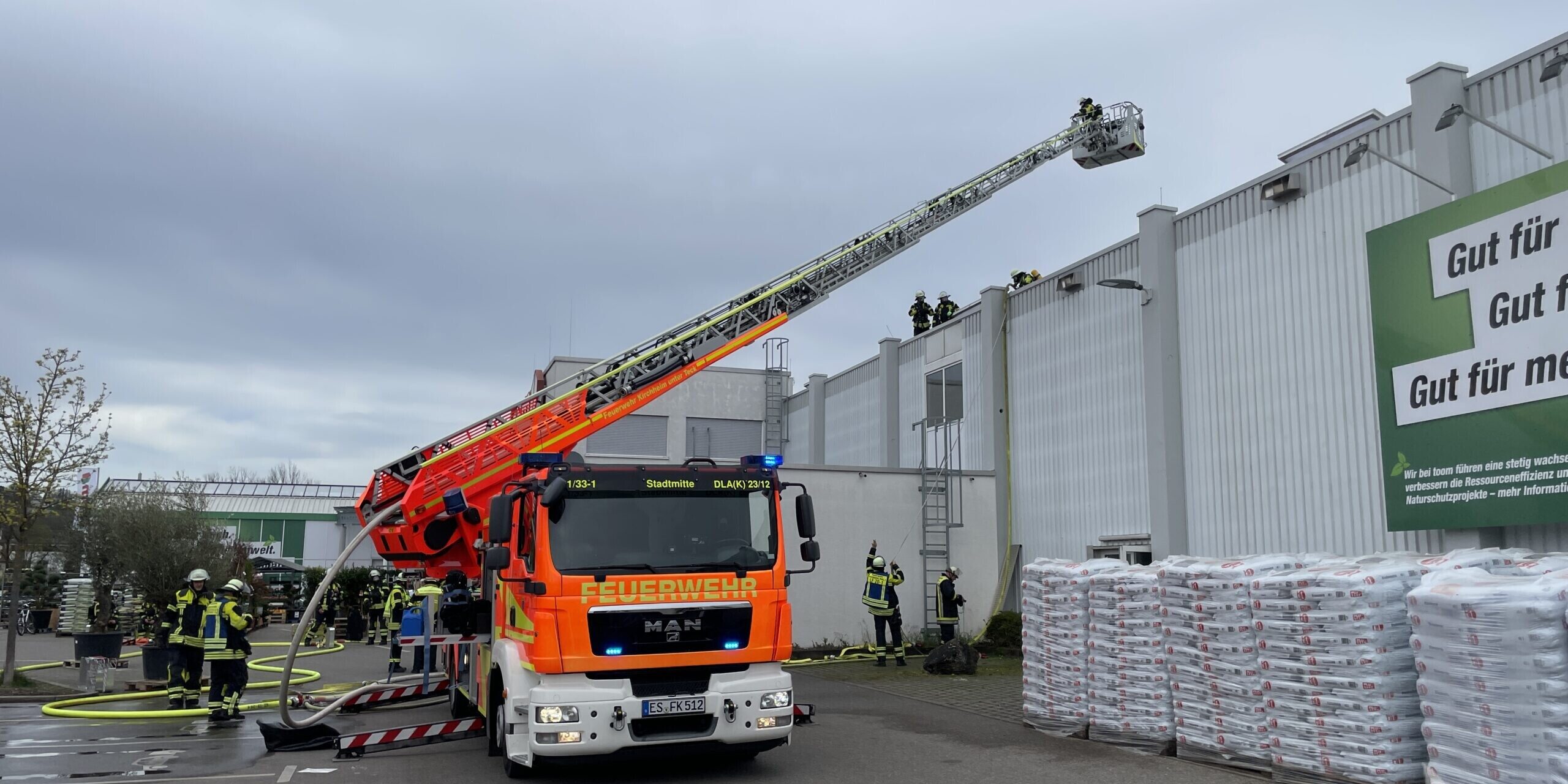 Am Sonntagnachmittag ist bei einem Baumarkt in der Stuttgarter Straße ein Feuer ausgebrochen. Kurz vor 13.00 Uhr gingen mehrere Notrufe bei der Feuerwehr und Polizei ein, bereits auf Anfahrt der Einsatzkräfte war eine Rauchsäule über dem Gebäude erkennbar. Zum Zeitpunkt des Brandausbruchs war der Markt geschlossen. Die Besucher eines naheliegenden Fitnessstudios wurden von der Polizei in Sicherheit gebracht. Es wurden keine Personen verletzt. Nach derzeitigem Ermittlungsstand dürfte der Brand durch einen technischen Defekt entstanden sein, sowohl ein Teil der auf dem Dach montierten Photovoltaikanlage als auch einzelne Bereiche des Marktinneren wurden in Mitleidenschaft gezogen. Eine Schadenshöhe kann derzeit noch nicht beziffert werden. Während den Löscharbeiten wurde die Henriettenstraße und Boschstraße bis 15.20 Uhr gesperrt. Es waren 14 Fahrzeuge der Feuerwehr mit 80 Einsatzkräften, drei Fahrzeuge vom Rettungsdienst mit acht Einsatzkräften und sieben Polizeistreifen eingesetzt.