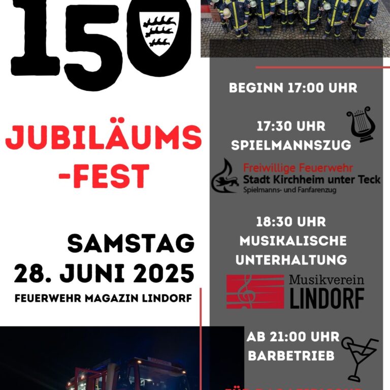 Die Abt. Lindorf feiert ihr 150-jähriges Jubiläum Die Freiwillige Feuerwehr Kirchheim unter Teck, Abteilung Lindorf, feiert in diesem Jahr ihr…